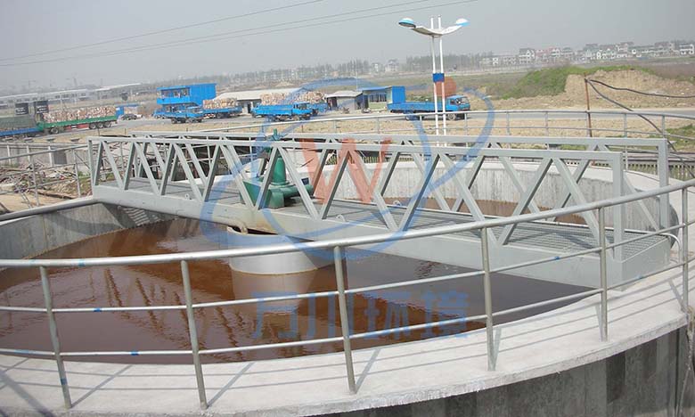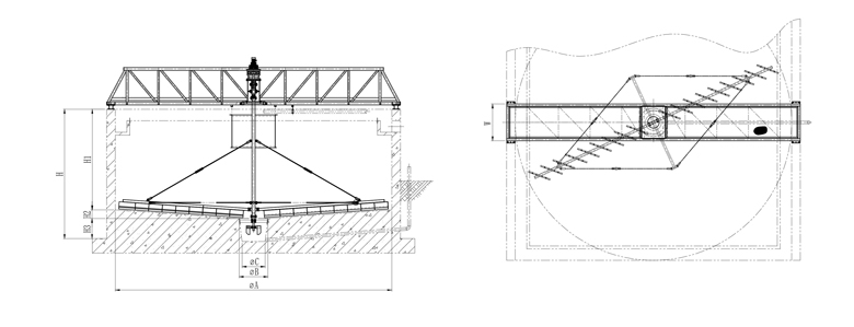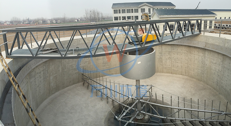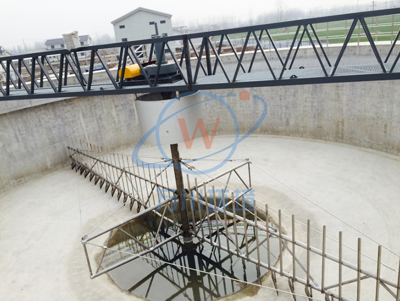 中心傳動刮泥機(jī)采用中心傳動、懸掛式,污水從工作橋下進(jìn)水管流入導(dǎo)流筒擴(kuò)散后,均勻的向周邊呈輻射狀流出,呈懸浮狀的污泥經(jīng)沉淀后沉積于池底,驅(qū)動裝置帶動中心立軸旋轉(zhuǎn),并帶動刮臂及刮泥板轉(zhuǎn)動,將污泥從池周刮向中心集泥槽后,靠池內(nèi)靜水壓由排泥管排出池外,水面上的浮渣通過旋轉(zhuǎn)撇渣裝置撇向池邊,再由刮渣耙刮進(jìn)排渣斗內(nèi)排出池外;而上清液則通過三角形出水堰板溢入出水槽內(nèi)排出。