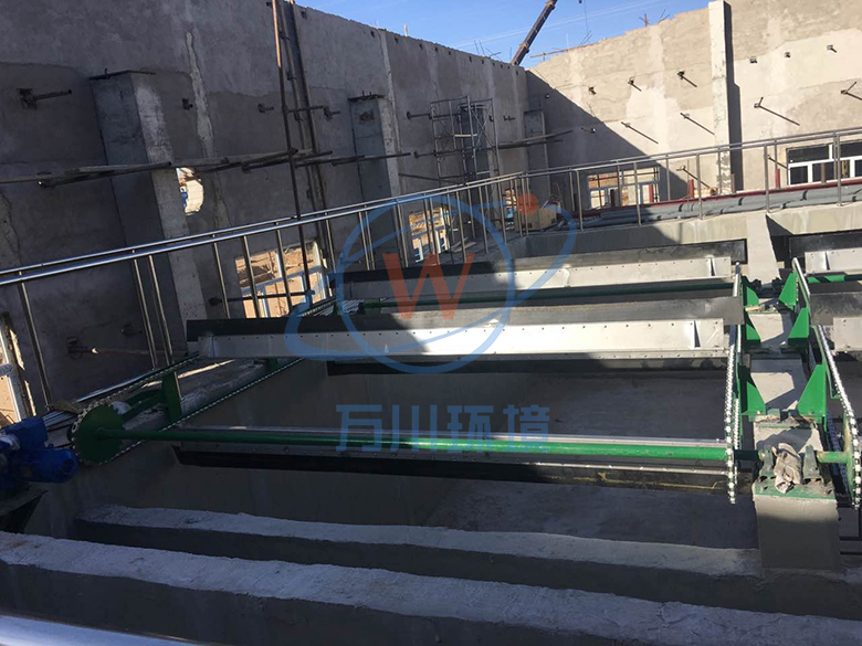 鏈板式刮沫機主要由減速機,傳動裝置,刮板,主從動軸,鏈條及鏈條托架組成。結構簡單,使用方便,性能穩定。減速機可調速或定速。