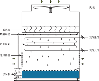 其一是內部循環 : 冷卻介質經過熱源換熱升溫后進入冷卻管束, 通 過冷卻管束將熱量送到管束表面 , 再由流經管束的水膜蒸發與對流 換熱傳給空氣冷卻后的冷卻介質再由水泵送往熱源。