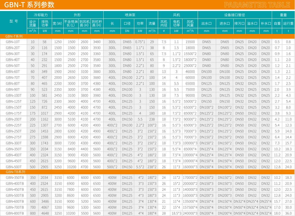 GBN -T系列逆流式冷卻塔是通過三個循環系統來降低冷卻介質溫 度的冷卻塔。