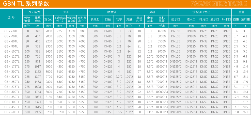 GBN -TL系列干濕聯合冷卻塔聯合了空氣冷卻和蒸發冷卻的換熱 優勢, 可以實現干、濕聯合運行。 當環境溫度高時, 可設置蒸發冷卻 為換熱主體, 空氣冷卻為輔助 , 大部分熱負荷由蒸發冷卻承擔; 當 環境溫度較低時 , 可設置空氣冷卻為換熱主體 , 蒸發冷卻為輔助 , 大部分熱負荷由空氣冷卻承擔 , 蒸發冷卻可停水干運行。 可較大程度實現循環水冷卻過程的節水、 節約運行費用的目的。